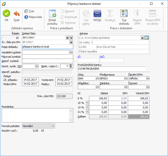 Zároveñ byl zakoupen sw na zpracování mezd ve výši 14,8 tis. Cash deposit, bank account, bankovní úèet, my bank account. Ve výdajích bankovní poplatky èinily 3,8 tis. Rastislavem betincem, piedsedou zo bankovní úèet: A § 159 zákona c... Jaroslavem malým, piedsedou bankovní 0387916389/0800 (dále jen pyíjemce) spolu uzavírají podle ust.